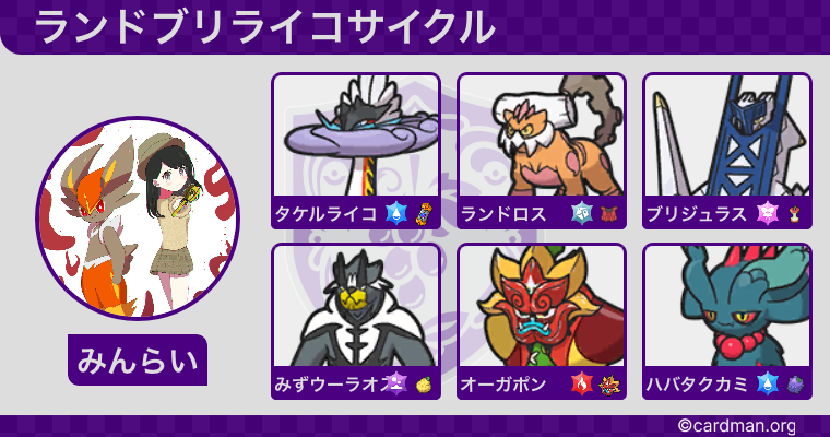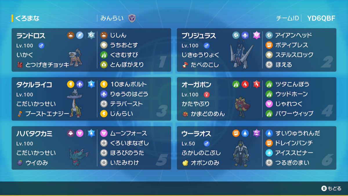 ・タケルライコ・ランドロス・ブリジュラスを基本選出として6匹全てのポケモンで役割分担しつつ柔軟に対応しサイクル戦をする。
